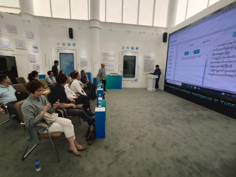 实验室研发人员向何社长一行汇报了实验室在机器翻译、跨语言事件检索等方面的研究进展与成果,并展示了云岭翻译、小语洞听、小语洞见、小语会议等软硬件产品。