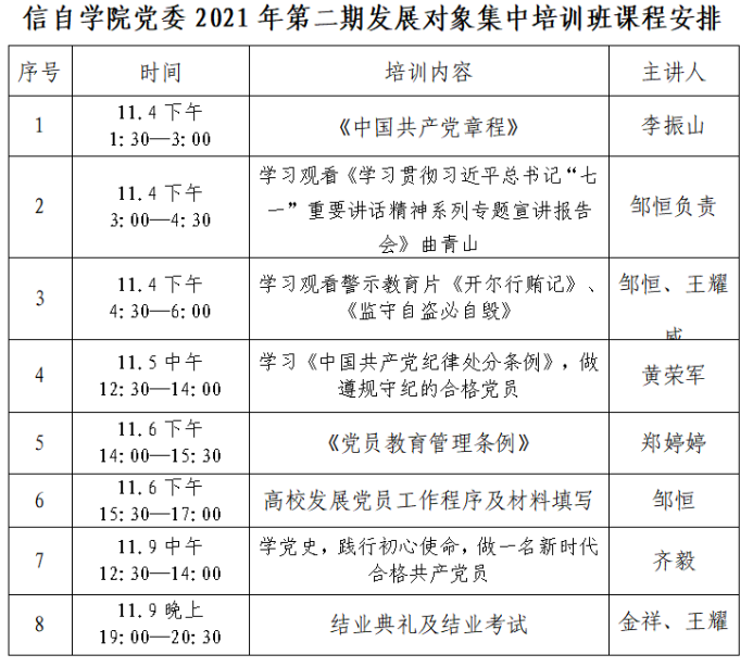 按照《中国共产党章程》和《中国共产党发展党员工作细则》相关规定,结合篮球投注党委2021年发展党员工作安排,11月2日-11月9日,篮球投注 2021年第二期发展对象集中培训班于信自235举行,对2021年11月篮球投注党委备案通过的54名发展对象进行了8个专题24个学时的集中培训,具体安排如下表: