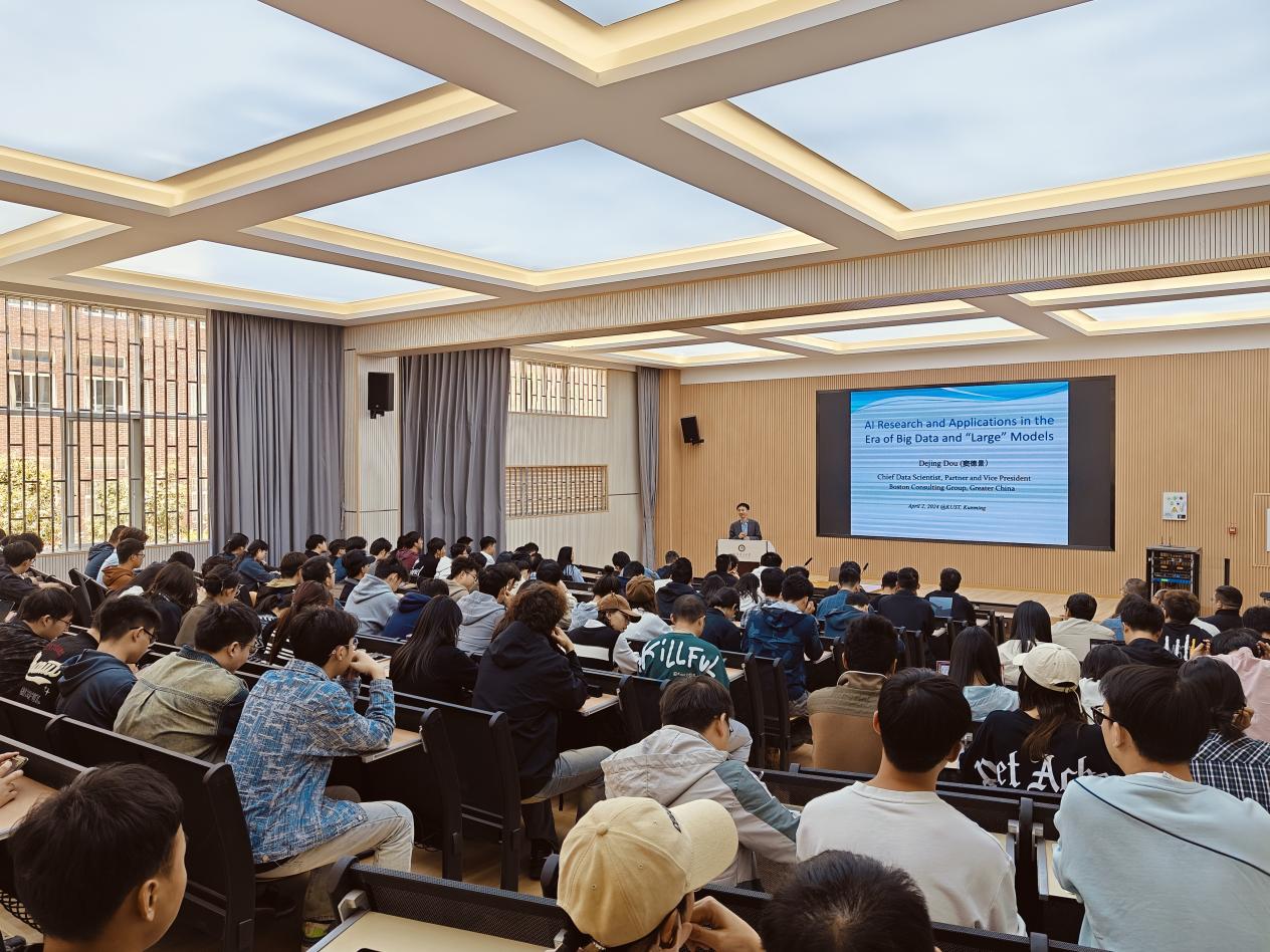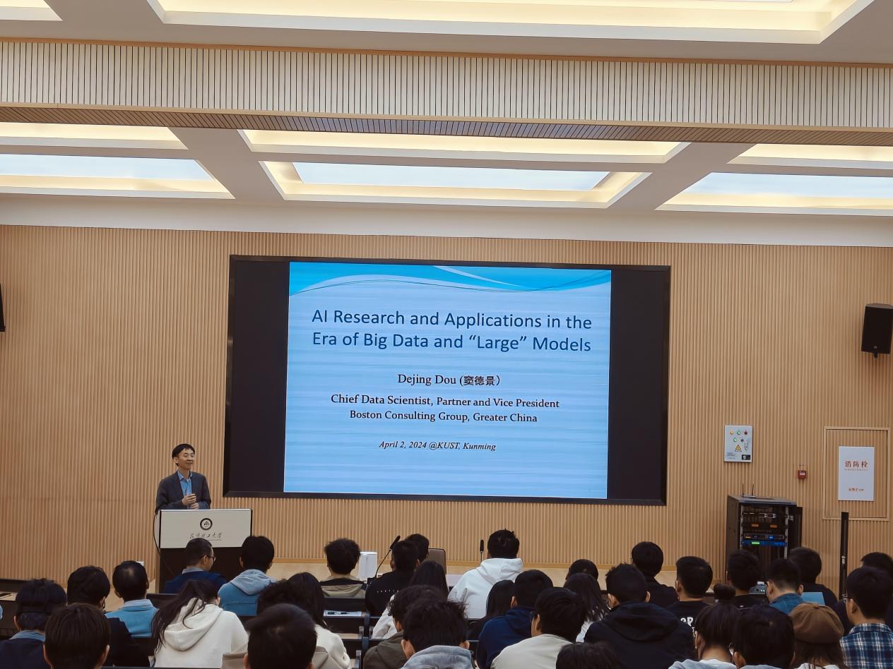 “致远大讲堂”邀请波士顿咨询合伙人、副总裁窦得景教授为昆工师生作关于“大数据和大模型时代的AI研究和应用”学术讲座。本次讲座在计算机重点实验室100报告厅进行,我院师生近200余人参会。