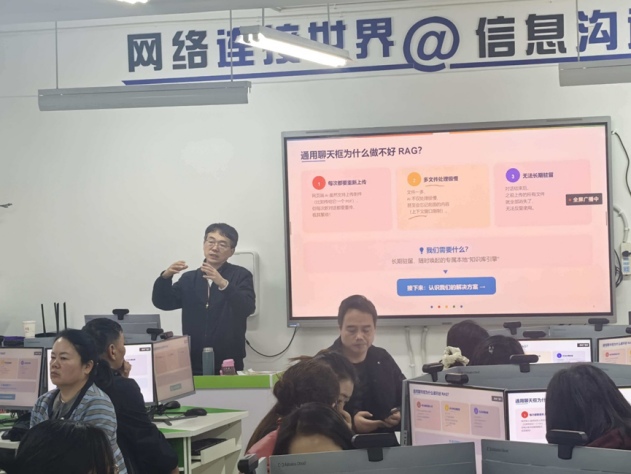 学校全体教师参训,校长作动员部署,强调教育数字化转型的重要意义。授课教师围绕人工智能前沿技术与教育场景应用开展专题教学,结合生成式 AI、智慧课堂等内容,用典型案例拆解AI辅助教学的实操方法,参训教师积极交流探讨,夯实AI教学认知与应用基础。