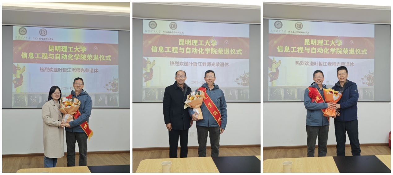 仪式最后,学院领导为叶哲江老师献上鲜花、赠送荣休纪念品,代表全院师生向其致以诚挚祝福,祝愿他退休生活惬意充实、身体健康、家庭幸福、万事如意。整场荣退仪式在轻松愉悦、温情满满的氛围中圆满结束。