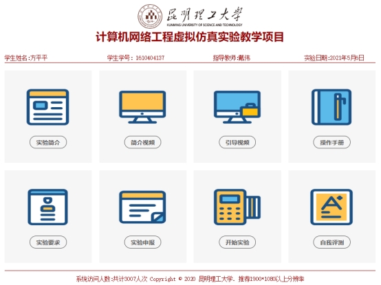 以下为自主设计开发的“计算机网络工程”虚拟仿真实验教学平台,集实验指导书、操作指导视频、引导视频、在线网络实验、答题等功能于一体,并已获得软件著作权。