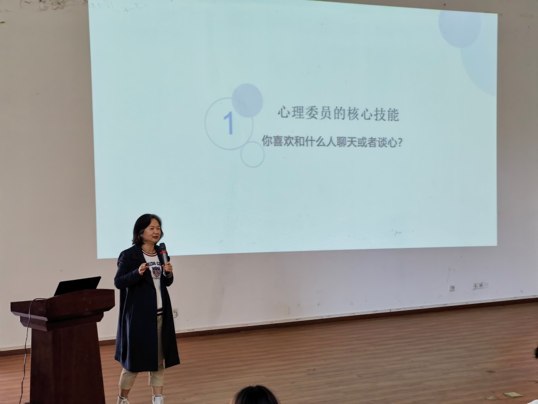 培训中刘海燕老师为全体心理委员讲授了心理委员需要掌握的核心技能、危机干预与自杀干预、自我照顾三方面内容,并重点对沟通技巧中的倾听与反馈做了针对性地互动练习。